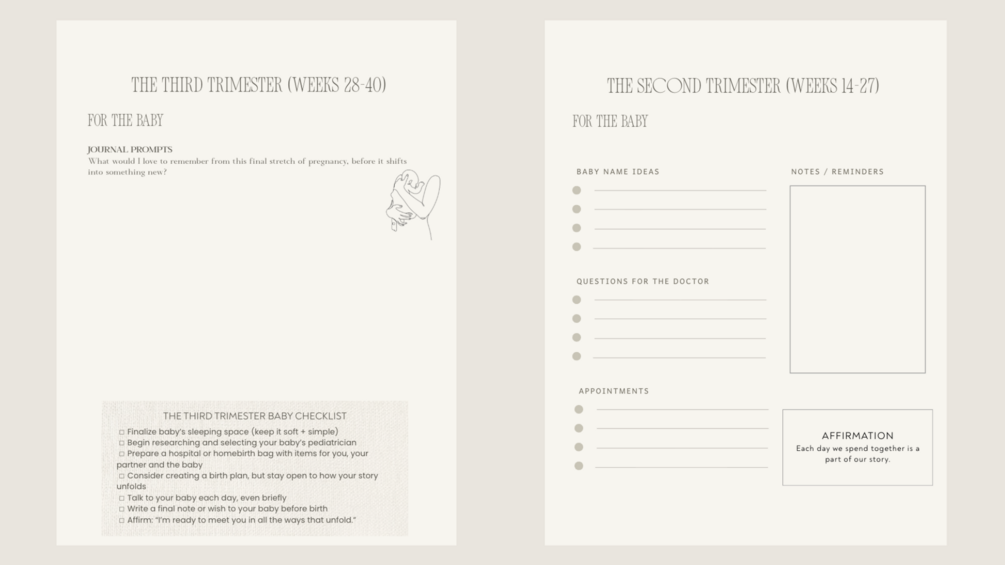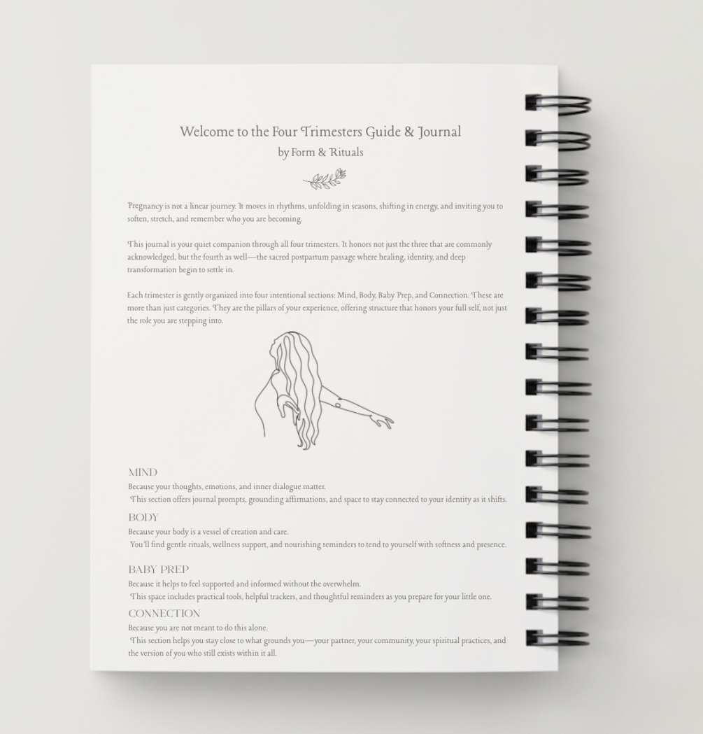 The Four Trimesters Guide & Journal by Form & Rituals is a beautifully designed digital planner that gently supports you through all stages of pregnancy and postpartum. Designed for mindful reflection, whether you're preparing for birth or finding your rhythm as a new mother.